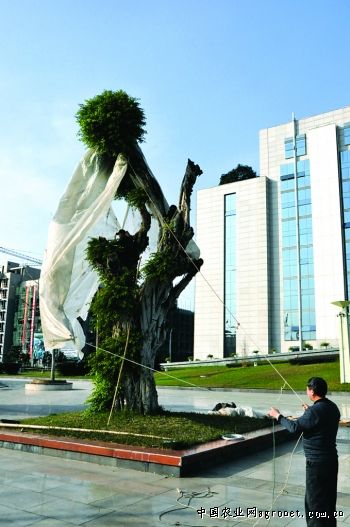 12月11日,筆者在儀隴縣行政中心廣場看到,工人正在給廣場上的一棵老榕樹搭建防凍棚,讓榕樹安穩(wěn)過冬。 中國苗木網(wǎng),999miaomu.com