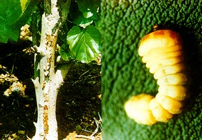 中國(guó)苗木網(wǎng),999miaomu.com 學(xué)名 Xy10trechus chinensis Chevrolat 鞘翅目,天牛科。別名虎天牛、虎斑天牛。分布在全國(guó)主要桑蠶區(qū)。 999苗木網(wǎng),999miaomu.com 寄主 桑、蘋(píng)果、柑桔、葡萄等。 苗木網(wǎng),www.jin1234.com 為害特點(diǎn) 幼蟲(chóng)蛀食桑樹(shù)枝干,致隧道寬大,樹(shù)皮龜裂,養(yǎng)分、水分傳送受阻,使桑樹(shù)枝細(xì)葉小,產(chǎn)量降低,嚴(yán)重的大量枯死。近年該蟲(chóng)在北方老桑園中為害猖撅,有的寄生率高達(dá)60一80%。嚴(yán)重影響桑葉產(chǎn)量、質(zhì)量。 形態(tài)特征 成蟲(chóng)體長(zhǎng)16—28mm,形似胡蜂。觸角短,僅達(dá)鞘翅基部。前胸背板近球形,有黃、赤褐、黑色橫條斑。鞘翅基部寬闊,翅上生黃色和黑色相間的斜帶。雌蟲(chóng)前胸背板前緣鮮黃,腹部末端尖,裸露鞘翅之外。雄蟲(chóng)前胸背板前緣灰黃色至褐色,腹部末端被鞘翅蓋住。卵長(zhǎng)5mm,長(zhǎng)橢圓形,乳白色。末齡幼蟲(chóng)體長(zhǎng)80mm,淺黃色,圓筒形。頭小,藏在第一胸節(jié)內(nèi)。第一胸節(jié)膨大,背面前緣及兩側(cè)各生一褐色塊狀斑紋。腹部各節(jié)背面、腹面具黃褐色步泡突。裸蛹長(zhǎng)30mm,紡錘形,淺黃色。 生活習(xí)性 遼寧、山東3年發(fā)生二代,以幼蟲(chóng)越冬。翌年4月上中旬開(kāi)始活動(dòng),5月上旬—6月下旬老熟幼蟲(chóng)陸續(xù)化蛹,6月上旬開(kāi)始羽化、交配產(chǎn)卵,6月下旬一7月上旬進(jìn)入羽化高峰期。成蟲(chóng)出孔后很快交尾產(chǎn)卵,孵化后的幼蟲(chóng)蛀食至11月上旬即越冬。第二年春季繼續(xù)為害至7月下旬到8月間,成蟲(chóng)羽化出孔,完成l代;前后共14個(gè)月。成蟲(chóng)再產(chǎn)卵后孵化的幼蟲(chóng)要越二次冬,在第4年的6月再羽化,共經(jīng)22個(gè)月才又完成一個(gè)世代,因此完成2個(gè)世代,約需3年。該蟲(chóng)世代重疊十分明顯。卵期10.6天。幼蟲(chóng)蛻皮5—6次,幼蟲(chóng)老熟后調(diào)頭向上蛀食7—8cm,在隧道一側(cè)蛀1橢圓形蛀入孔。老熟幼蟲(chóng)經(jīng)蛀入孔深入木質(zhì)部,蛀成“7”形隧道,并咬很多木屑堵住隧道上方形成蛹室,化蛹在蛹室里,蛹期21天。成蟲(chóng)羽化出來(lái)后把木屑和蟲(chóng)糞扒開(kāi),從原蛀入孔再咬開(kāi)表皮而出孔。雌蟲(chóng)把卵產(chǎn)在樹(shù)干的裂口或縫隙內(nèi),每次產(chǎn)1粒,每雌可產(chǎn)104粒。雌蟲(chóng)壽命18.6天,雄蟲(chóng)24.8天。品種間受害程度有差異:秋雨、鐵把、劍持、湖桑等品種受害重于大白條、西昌、嘟嚕桑等。地桑、無(wú)干的密植桑不受害。樹(shù)齡大受害重,樹(shù)齡小受害輕。生長(zhǎng)旺盛、樹(shù)皮裂縫少、枯死組織少受害輕。天敵有啄木鳥(niǎo)。 999中國(guó)苗木網(wǎng),www.jin1234.com 防治方法 (1)6月上旬—8月上旬捕捉成蟲(chóng)。(2)刺殺桑皮內(nèi)的幼蟲(chóng)。(3)挖除的枯死株,要求在5月下旬以前燒毀。(4)全力養(yǎng)護(hù)新栽幼桑,樹(shù)皮上有油浸狀小黑點(diǎn)時(shí),及時(shí)捕殺樹(shù)內(nèi)幼蟲(chóng)。夏伐后要再仔細(xì)檢查一次。(5)必要時(shí)用毒簽插入最下蛀孔或用80%敵敵畏乳油10倍液浸漬的棉球堵塞蛀入孔。也可用50%殺螟松乳油l00倍液于夏伐后噴灑樹(shù)皮。(6)注意保護(hù)天敵。 中國(guó)苗木網(wǎng),www.jin1234.com (記者 佚名) 999中國(guó)苗木網(wǎng),999miaomu.com