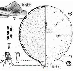 【學(xué)名】Bambusaspis hemisphaerica 中國苗木網(wǎng),www.jin1234.com 【類屬】屬同翅目鏈蚧科 苗木網(wǎng),999miaomu.com 【分布】國內(nèi)分布于廣東、江酉、江蘇、浙江、安徽、山東、上海、陜西等地 苗木網(wǎng),999miaomu.com 【危害】可以為害多種竹類植物。寄生于當(dāng)年新發(fā)出的嫩枝及嫩梢的節(jié)間和芽眼,被害后嫩枝停止生長、節(jié)間縮短,造成竹葉落枝枯,嚴(yán)重影響竹的生長、發(fā)筍和竹林衰敗。 999中國苗木網(wǎng),www.jin1234.com 【形態(tài)特征】成蟲:雌蟲蠟殼堅(jiān)硬、半球形隆起、前端圓而后端狹、光滑透亮具光澤、青黃色,長2.5-3.0mm、寬1.5-2.0mm,蠟殼包裹小枝達(dá)1/4-1/2,邊緣密生白色碎片狀蠟絲;圓形瘤狀觸角具2長毛和1短毛,觸角與體緣之間有五格腺帶;具氣門路五格腺的氣門大,體緣2列“8”形腺在體后并為1列,五格緣腺與“8”形腺成一寬帶、該帶向腹末漸窄并中斷,6-10格的多格腺在腹面形成2完整的及6條斷續(xù)的橫列,管腺散布體背、在后端僅1對大背管腺,體背小“8”形腺稀疏散布;臀瓣不發(fā)達(dá)、端部毛短,肛環(huán)孔2列,短肛環(huán)刺毛6根。雄蟲長橢圓形的蠟殼兩側(cè)近平行,緣蠟絲稀疏,長約1mm,淡赤褐色,眼紅色;念珠狀觸角10節(jié);白色前翅透明有2縱脈,腹部黃色、尖細(xì),交配器針狀,腹未白色長蠟絲2根。 中國苗木網(wǎng),999miaomu.com 卵:橢圓形,淡黃色,長0.4mm,寬0.2mm。 中國苗木網(wǎng),999miaomu.com 若蟲:體橢圓形,淡赤褐色,長0.4-0.45mm、寬0.2-0.25mm。觸角6節(jié),足發(fā)達(dá),體緣“8”形腺明顯;肛環(huán)發(fā)達(dá)、肛環(huán)刺毛6根,腹末端毛2對。 999中國苗木網(wǎng),999miaomu.com 【發(fā)生規(guī)律】在江蘇以1年1代為主,亦有1年2代的現(xiàn)象;在安徽則l年2代,均以受精雌成蟲和2齡若蟲越冬。越冬若蟲于翌年5月陸續(xù)發(fā)育為成蟲。雌成蟲出現(xiàn)盛期在5月中旬,孕卵期約1個(gè)月,至6月上旬開始產(chǎn)卵。 999苗木網(wǎng),www.jin1234.com 越冬的受精雌成蟲,于翌年2月恢復(fù)取食,蟲體逐漸膨大開始孕卵,孕卵期約3個(gè)月,5月中旬開始產(chǎn)卵。每頭雌成蟲一般產(chǎn)卵量為400粒左右,最多553粒,最少107粒。卵產(chǎn)于雌蟲蠟殼之后端。卵期1-2天,第一代若蟲5月中旬開始孵化,盛孵期在5月下旬和6月中旬。一天中孵化量以10-15時(shí)較集中。初孵若蟲活潑,每分鐘爬行3-4cm,一般爬行36-48小時(shí),在當(dāng)年生的小技、竹節(jié)、芽鱗及葉柄基部固定。固定后3-4天,體緣出現(xiàn)白色蠟粉,此后逐漸形成蠟殼。若蟲生長發(fā)育17天左右便可區(qū)別雌雄。雄蟲多寄生于當(dāng)年嫩葉的葉柄基都;雌若蟲多寄生于當(dāng)年生小校或節(jié)間上。第一代雄若蟲6月底化蛹,蛹期3-4天,7月上旬為雄成蟲羽化盛期,7月中旬羽化結(jié)束,羽化率為85%左右。第一代雌成蟲交尾受精后,大多不再發(fā)育,越冬到翌年春恢復(fù)取食后孕卵。另有少部分繼續(xù)發(fā)育,于8月初開始孕卵,孕卵期約1個(gè)月,9月上、中旬開始產(chǎn)卵、孵化。孵化若蟲發(fā)育到2齡,于10月底、11月初先后在嫩枝上越冬。半球竹鏈故的天敵有一種挑小蜂和一種光小蜂。 999苗木網(wǎng),999miaomu.com 【防治方法】(1)農(nóng)業(yè)防治。 苗木網(wǎng),999miaomu.com 加強(qiáng)營林管理,盡量伐除嚴(yán)重受害竹株;密林間伐,以促進(jìn)竹的生長;適當(dāng)施肥,以增強(qiáng)抗蟲能力。 苗木網(wǎng),www.jin1234.com (2)保護(hù)與利用天敵。 中國苗木網(wǎng),999miaomu.com (3)藥劑防治。 苗木網(wǎng),www.jin1234.com 加強(qiáng)監(jiān)測,于若蟲孵化后一星期左右用80%敵敵畏乳油,或40%樂果乳油或50%殺螟松乳油,或25%亞胺硫磷乳油1000倍液,或50%馬拉硫磷乳油800倍液噴殺,效果良好。 苗木網(wǎng),www.jin1234.com (記者 佚名) 999苗木網(wǎng),www.jin1234.com