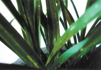 形態特征蘭花介殼蟲俗稱蘭虱,是一種刺吸式口器的害蟲。雌蟲介殼長形,腹部向兩側突出,黃色;雄蟲介殼細長形,長約1毫米,白色,有深縱背、殼點淡黃褐色,伸出介殼一端。卵淡黃色,橢圓形,長約0.1毫米。初孵若蟲卵圓形,黃褐色。 發生規律該蟲一年發生2至3代,以受精雌成蟲在蘭葉上越冬。翌年5月,產卵于雌成蟲介殼內,初孵若蟲爬出雌蟲介殼,經短期爬行后,固著于蘭藥葉片主脈、葉緣等處吸汁為害,并逐漸形成介殼。8月出現第二代若蟲,9、10月間發育成熟,羽化交尾。 999苗木網,999miaomu.com 危害情況一般在6月至9月危害最盛,蘭虱常常集中在蘭葉的基鞘和筋脈處吸取營養,分泌出大量的病菌。莖葉變成霉褐色,引起各種病癥,光合作用受阻,使蘭花長勢減弱。嚴重時,葉片出現淡黃小斑及黃斑,后逐漸擴大,以致整片葉枯黃,失綠而脫落,甚至全株死亡。 999苗木網,999miaomu.com 防治方法:1.少量發生時,可用軟牙刷或小棕刷,順著葉片輕輕刷除,也可用薄竹片將蟲體刮除。 苗木網,www.jin1234.com 2.養植環境及蘭盆要通風透光,盆土不宜過濕。 中國苗木網,www.jin1234.com 3.可用80%的敵敵畏乳劑加1000至1500倍水,制成溶液噴殺2遍,每周1次。 999中國苗木網,www.jin1234.com 4.在盆土周圍施5%呋喃丹5至8克,灌水一次,7天后即可殺滅。 999中國苗木網,999miaomu.com 5.發現病情時,將病株隔離,防止傳染。 苗木網,999miaomu.com