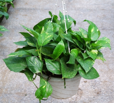 綠蘿是大型常綠藤本植物。生長于熱帶地區常攀援生長在雨林的巖石和樹干上,可長成巨大的藤本植物。綠色的葉片上有黃色的斑塊。其纏繞性強,氣根發達,既可讓其攀附于用棕扎成的圓柱上,擺于門廳、賓館,也可培養成懸垂狀置于書房、窗臺,是一種較適合室內擺放的花卉。