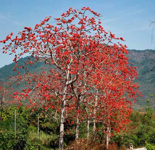木棉,落葉大喬木,原產(chǎn)印度。高10-20 公尺。樹干直,樹皮灰色,枝干均具短粗的圓錐形大刺,后漸平緩成突起。樹干基部密生瘤刺,枝輪生,葉互生。每年2-3月份先開花,后長葉。樹形高大,雄壯魁梧,枝干舒展,花紅如血,碩大如杯,盛開時葉片幾乎落盡,遠觀好似一團團在枝頭盡情燃燒、歡快跳躍的火苗,極有氣勢。因此,歷來被人們視為英雄的象征。