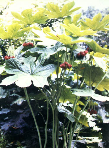 購(gòu)買各種苗木,請(qǐng)?jiān)?97苗木網(wǎng)發(fā)布求購(gòu)信息或者需找供應(yīng)商 苗木網(wǎng),www.jin1234.com 八角蓮|詳細(xì)介紹,597苗木網(wǎng)百科知識(shí),苗木知識(shí)專家—八角蓮介紹 八角蓮 DysosmaversipelliHancM.Cheng 999苗木網(wǎng),www.jin1234.com 小檗科 999中國(guó)苗木網(wǎng),999miaomu.com 多年生草本,高30-50厘米,稀達(dá)90厘米;?形態(tài)特征多年生草本,高30-50厘米,稀達(dá)90厘米;根狀莖橫生,粗狀,節(jié)結(jié)狀;莖直立,不分枝。莖生葉1或2如為2片,則1片生莖的近頂處,柄較短,另1片生莖的近中部,柄較長(zhǎng);葉片盾狀,近圓形,直徑達(dá)30厘米,4-9淺裂,裂片先端不裂,邊緣有細(xì)齒,上面無(wú)毛,下無(wú)毛或被疏毛。花深紅色或紅色,5-10朵,有時(shí)更多,簇生于近葉柄頂端與葉片相近處,下垂,花梗細(xì)長(zhǎng),下彎;萼片6綠色;花瓣6匙狀倒卵形,長(zhǎng)2-2.5厘米;雄蕊6子房上位,1室,柱頭盾形,漿果橢圓形;種子多數(shù)。? 中國(guó)苗木網(wǎng),www.jin1234.com 零星分布于河南南部商城、新縣,陜西南部鎮(zhèn)坪、平利、安康、紫陽(yáng)、鎮(zhèn)巴、嵐皋、南鄭、漢中,四川巫山、奉節(jié)、巫溪、城口、武隆、南川、合江、納溪、長(zhǎng)寧、屏山、高縣、峨眉山、灌縣、蒼溪,云南富寧、麻栗坡、文山、嵩明、鎮(zhèn)雄、彝良、大關(guān)、會(huì)東、騰沖,廣西龍州、富川、賀縣、大苗山、龍勝、資源,貴州凱里、雷山、荔波、安龍,湖北鶴峰、利川、建始、宜昌、興山、巴東、神農(nóng)架、秭歸、房縣、竹溪、通山、蒲圻、崇陽(yáng),湖南宜章、寧遠(yuǎn)、零陵、新寧、桑植,江西婺源、尋烏、井崗山、遂川、安福、九江、靖這,福建北部崇安和西北部建寧、泰寧,安微西部金寨和南部黟縣、黃山、浙江南部龍泉、文成、泰順等地。生于海拔200-2400米的陰濕林下。分布區(qū)屬東亞的亞熱帶季鳳氣候,年積溫4500-7500℃,最冷月平均溫0-15℃,年降水量一般高于1000毫米,最高可達(dá)3000毫米。土壤為黃棕壤、黃壤、紅壤、赤紅壤,pH值4.5-6.5常生于山谷、山坡常綠闊葉林、落葉闊葉林竹林下陰濕處或水旁、山溝石縫腐殖質(zhì)豐富的土壤中。喜陰濕環(huán)境,忌強(qiáng)光和干旱。花期4-7月,果期7-10月。 999中國(guó)苗木網(wǎng),999miaomu.com ? 999中國(guó)苗木網(wǎng),www.jin1234.com 中國(guó)苗木網(wǎng),www.jin1234.com 分株繁殖。選擇疏松。肥沃的砂質(zhì)土壤或腐殖質(zhì)土栽培。冬末或早春將根狀莖挖出,切開穴栽,每穴1株,早期應(yīng)遮蔭和勤澆水。亦可采用種子繁殖法。 苗木網(wǎng),www.jin1234.com 八角蓮為民間常用的中草藥,根狀莖和根含木聚糖類,如鬼毒素(podophyllotoxin去氫鬼臼毒素(dehydropodophyllotoxin脫氧鬼臼毒素(deoxyopdophyllotoxin等,對(duì)動(dòng)物腫瘤有抑制作用,但有毒,臨床上草醫(yī)用于治毒蛇咬傷、癰瘡癤腫、乳腺瘤等。葉形奇特,又可供觀賞。? 999中國(guó)苗木網(wǎng),www.jin1234.com