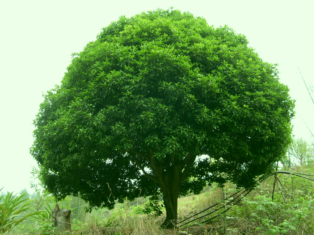香樟為樟科常綠喬木。樹勢高大雄偉,高可達60米,樹齡成百上千年,可成為參天古木,樹冠廣圓形,為優秀的園林綠化林木,幼時樹皮綠色,平滑,老時漸變為黃褐色或灰褐色縱裂;冬芽卵圓形。葉薄革質,卵形或橢圓狀卵形,長5—10厘米,寬3.5—5.5厘米,頂端短尖或近尾尖,基部圓形,離基3出脈,近葉基的第一對或第二對側脈長而顯著,背面微被白粉,脈腋有腺點。圓錐花序生于新枝的葉腋內,花黃綠色,春天開,圓錐花序腋出,又小又多。果球形,熟時紫黑色。花期4—6月,果期10—11月。因為樟樹木材上有許多紋路,像是大有文章的意思,所以就在「章」字旁加一個木字作為樹名,稱為“樟樹”。樟樹喜陽光充足,也稍耐半陰、溫暖、濕潤環境;不耐干旱和嚴寒。樟樹枝葉秀麗,樹大濃蔭,四季常青而具香氣。其木材優良,枝葉可提取樟腦和樟油,為化工及醫藥上重要原料。于1999年8月4日批準為國家Ⅱ級重點保護野生植物。