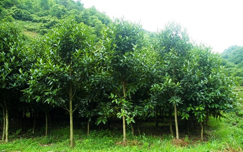 為了確保栽植成活率,在栽植過程中栽植要及時,即經過修剪的香樟樹苗應馬上栽植。如果運輸距離較遠的話,則根蔸處要用濕草、塑料薄膜等加以包扎以便保濕。栽植時間最好在上午11時之前或下午16時之后,而在冬季則只要避開最嚴寒的日子就行。種植穴要按一般的技術規程挖掘,穴底要施基肥并鋪設細土墊層,種植土應疏松肥沃。把香樟樹苗的包扎物除去,在種植穴內將樹苗立正栽好(注意樹的觀賞面),填土后再插實土壤并繼續填土至穴頂。最后,在樹苗周圍做出攔水的圍堰。樹苗栽好后要立即灌水,對于帶土球的樟樹苗邊灌水,還要用鐵棒或木棒對樹穴周邊土壤進行攪動,以便通過水的作用使樹穴周邊能填滿土壤。灌水時要注意不要損壞土圍堰,土圍堰中要灌滿水,讓水慢慢浸下到種植穴內。為進一步提高定植成活率,可在所澆灌的水中加入生長素,以便刺激新根生長。生長素一般采用奈乙酸,先用少量酒精將粉狀的奈乙酸溶解,然后摻進清水,配成濃度為200PPm的澆灌液,作為第一次定根水進行澆灌。移栽過程中,為了保持大香樟樹干的濕度,減少從樹皮蒸騰的水分,要對樹干進行浸濕草繩纏繞包裹直至到主干頂部,如果分枝較大也要進行纏繞。接著,再將調制的粘土泥漿厚厚地糊滿草繩纏繞著的樹干。以后,可經常用噴霧器為樹干噴水保濕。在大香樟掘起后,還要對斷根、破根和枯根進行修剪,剪后再用粘土泥漿浸裹樹根;泥漿中如果加入0.03%的奈乙酸生長素,可以促進大香樟移植后的新根的生長。由于是在不適宜的反季節中栽植香樟樹,因此,香樟樹栽好后就更加要強化養護管理。平時,要注意澆水,澆水要掌握“不干不澆,澆則澆透”的原則;還要經常對地面和樟樹葉面噴灑清水,增加空氣濕度,降低植物的蒸騰作用。